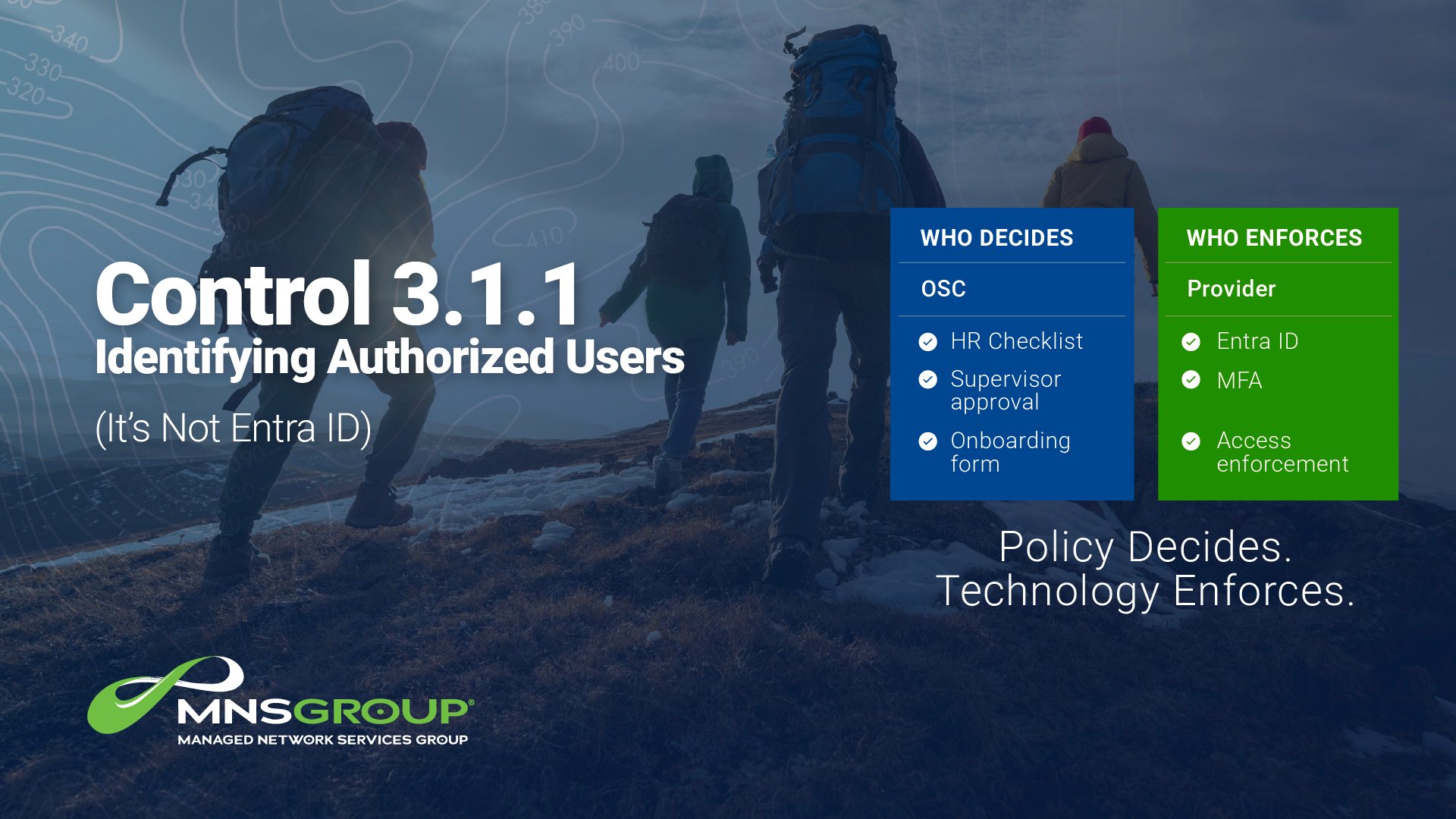This control falls clearly on the OSC. The responsibility for identifying who is authorized to use your systems belongs to your organization, not your service provider, not your consultant, and not Entra ID.
